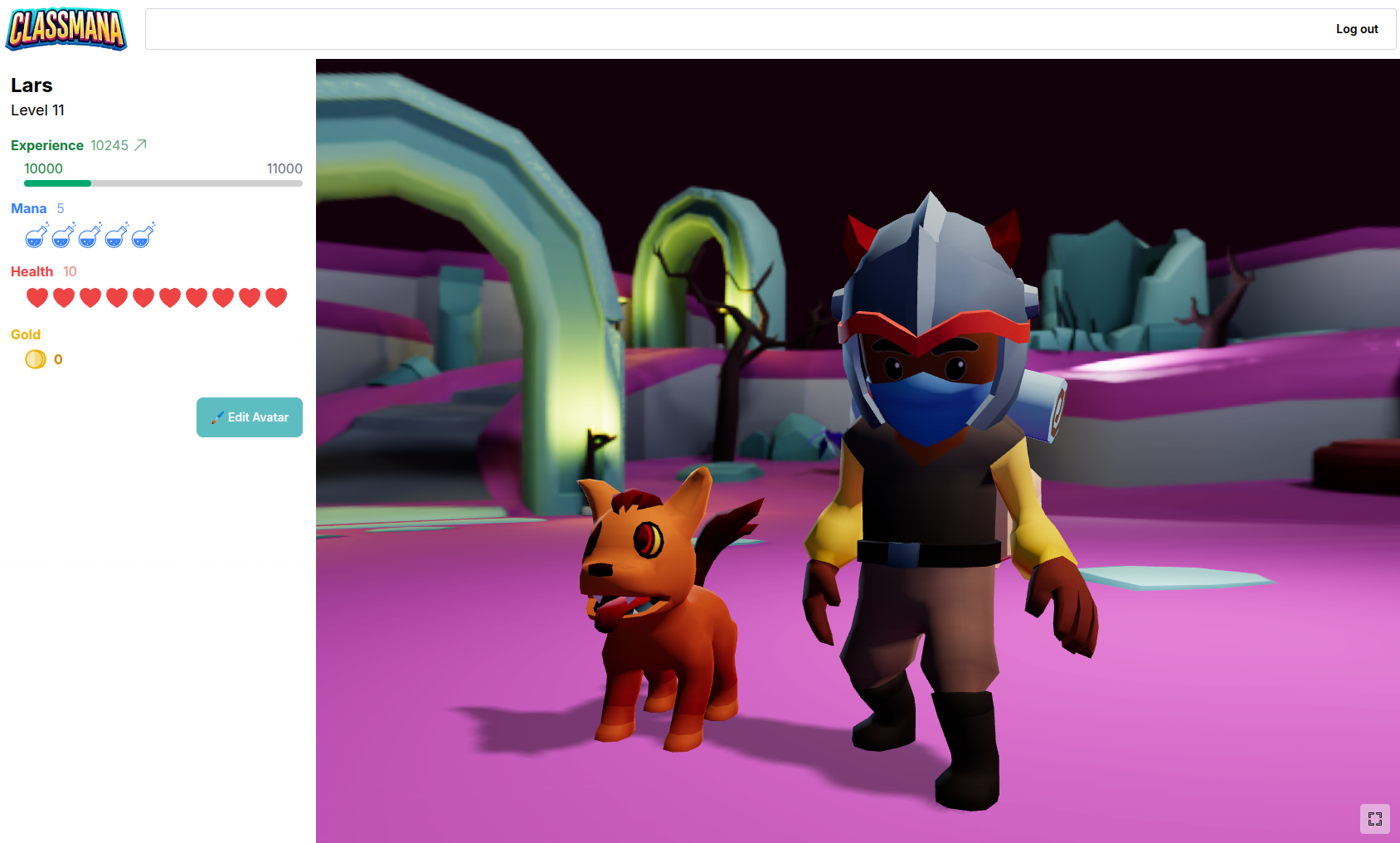 生徒がアバターダッシュボードにログインすると、パワーとショップ(ゴールドを有効にしている場合)という2つの新しいボタンが表示されます。