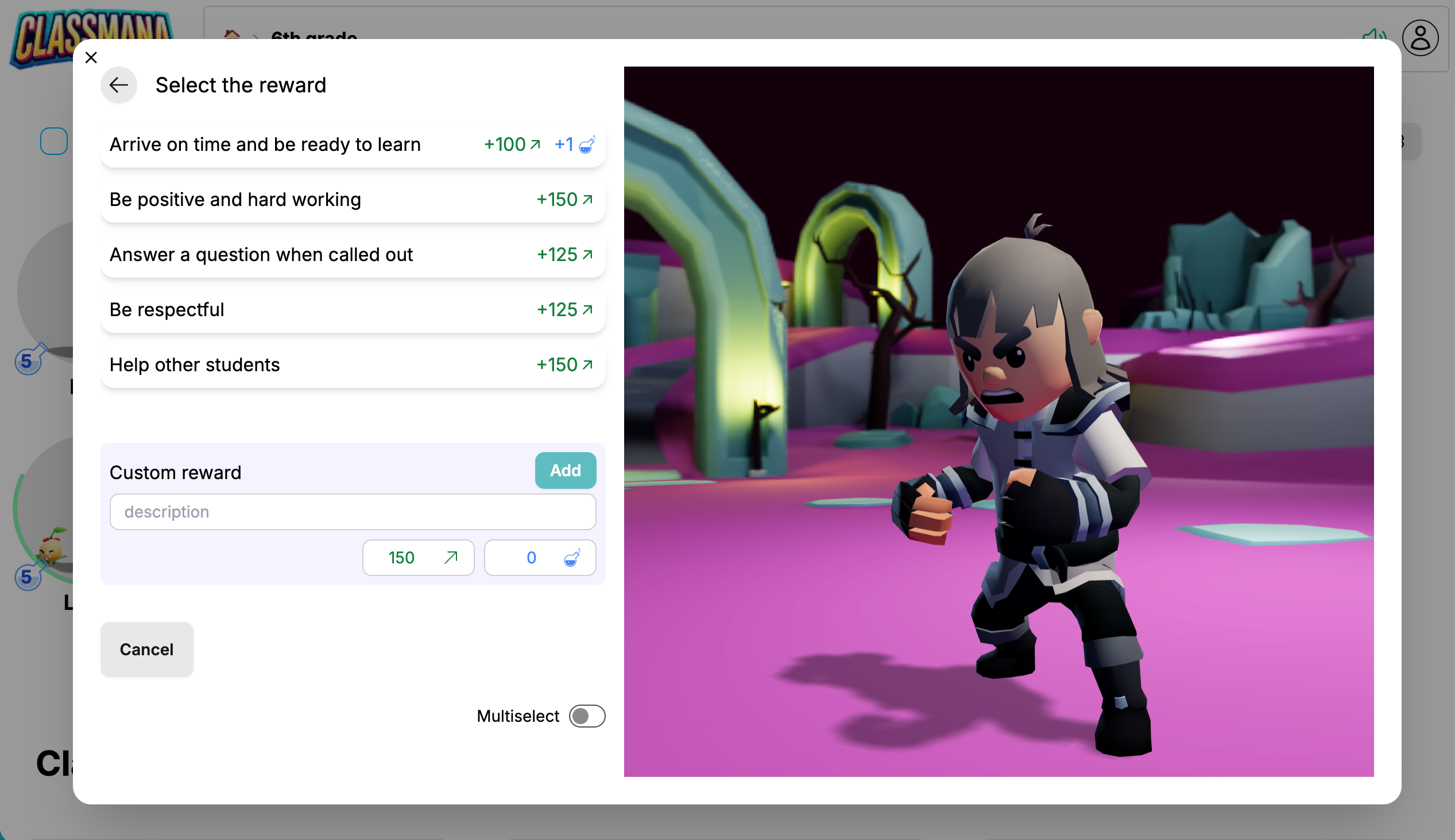 報酬パネルは同じように動作します - 事前設定された報酬をクリックするか、カスタム報酬を作成します。報酬は選択されたすべての生徒に適用されます。