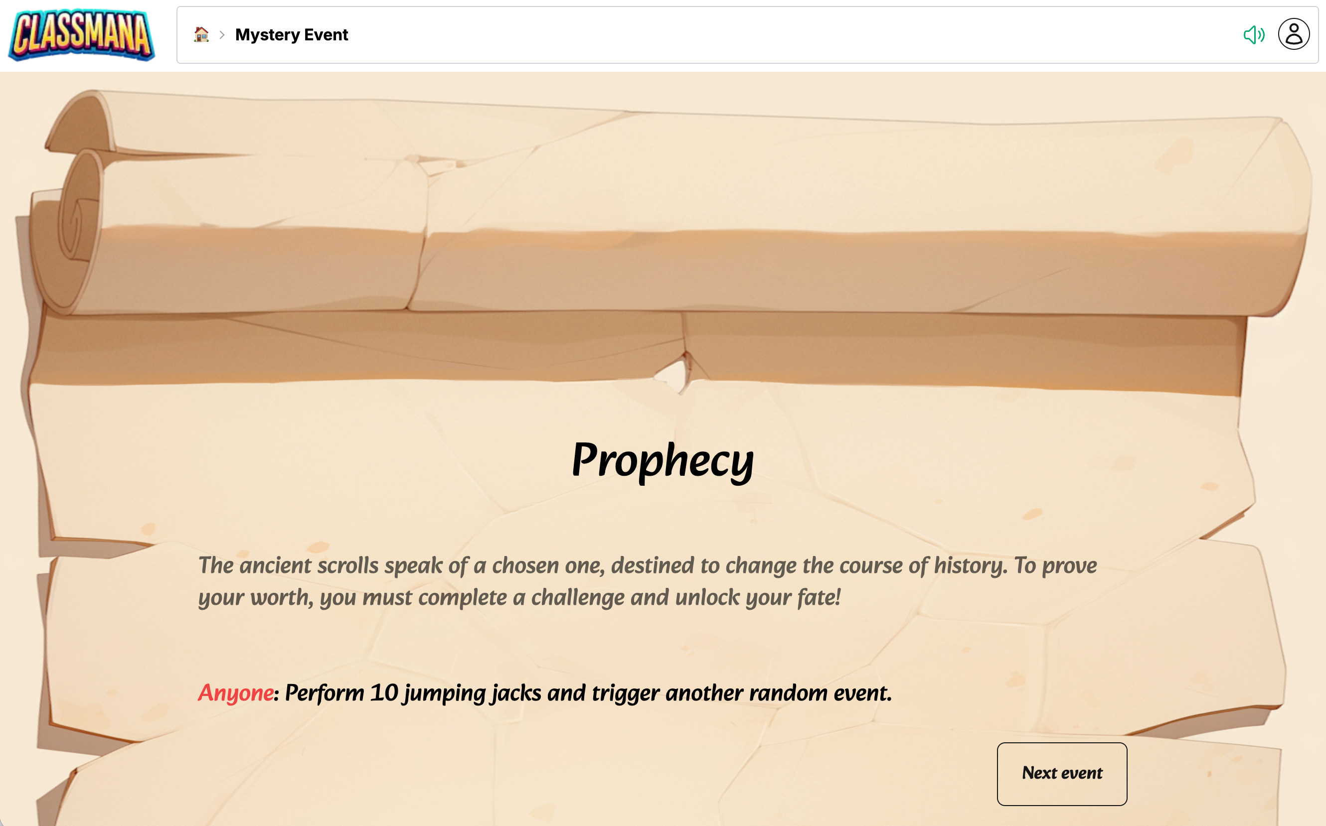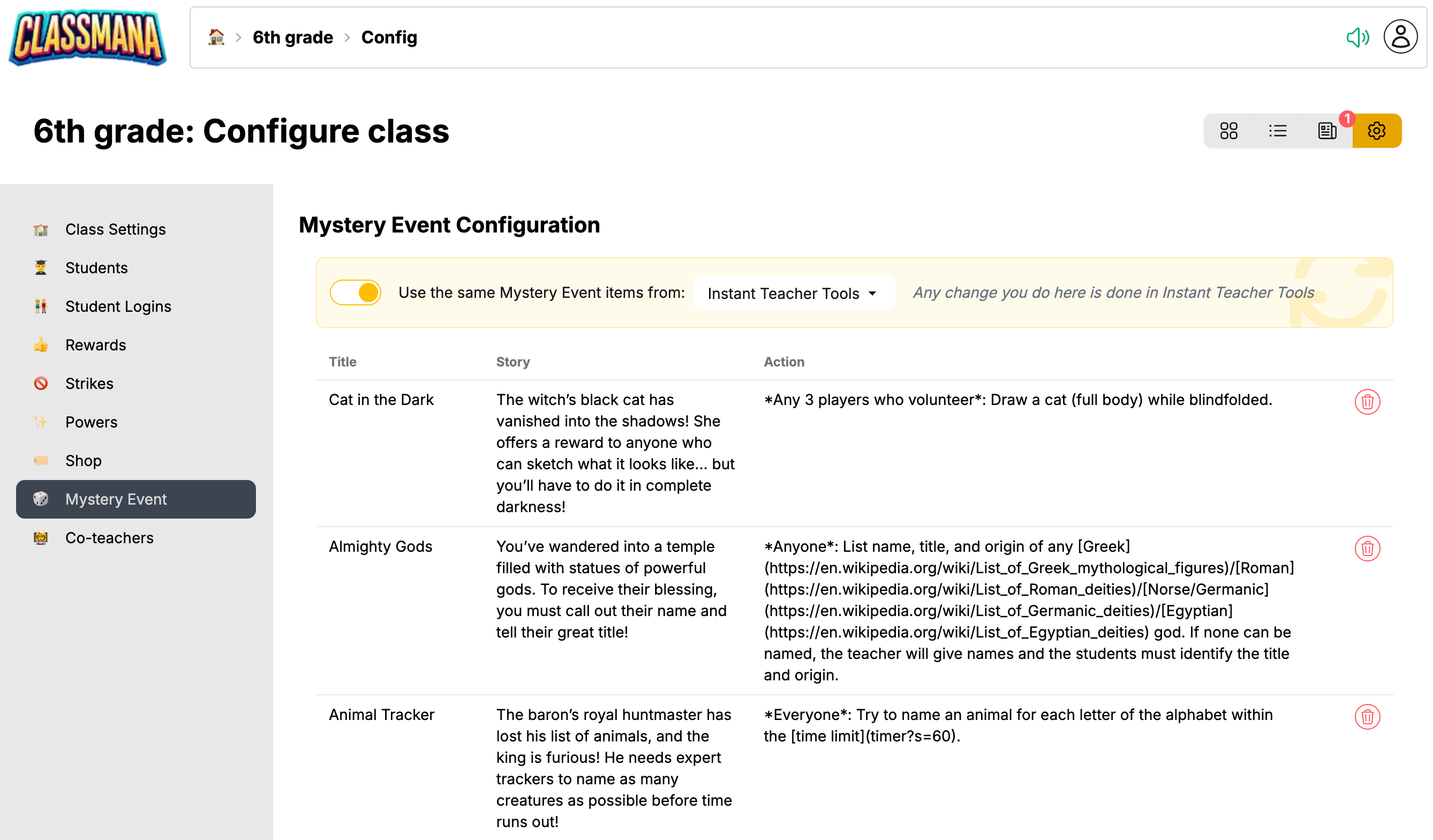 クラス内でミステリーイベントを使用する場合、各クラスは独自のイベントセットを持つことができます。または別のクラスから同期することもできます。🏠 ダッシュボード → クラス → ⚙️ 設定 → 🎲 ミステリーイベント からクラス設定内でアクセスしてください。