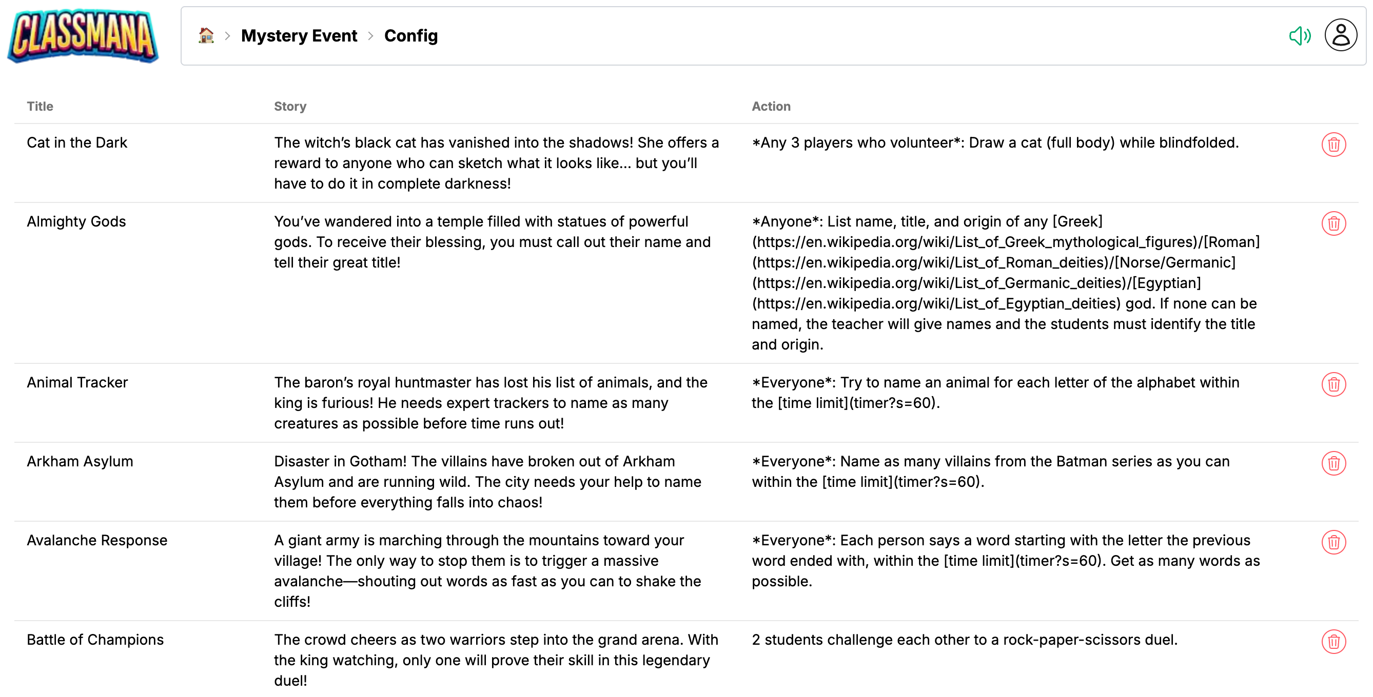 ClassManaイベントを削除するには、その行の削除ボタンをクリックします。